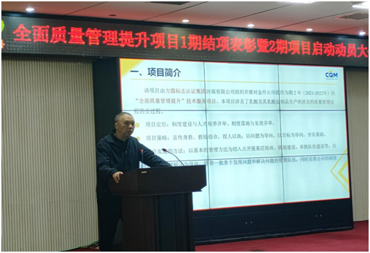 方圓標志認證集團河南有限公司助力企業(yè)高質(zhì)量發(fā)展3月8日,河南金丹乳酸科技股份有限公司(以下簡(jiǎn)稱(chēng)“金丹乳酸”)召開(kāi)了全面質(zhì)量管理提升項目一期結項表彰暨二期項目啟動(dòng)動(dòng)員大會(huì )。董事長(cháng)張鵬、副總經(jīng)理崔耀軍等公司領(lǐng)導,各部門(mén)及車(chē)間負責人、體系管理員及..